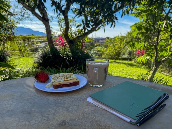 Dessa lugna morgnar har snabbt blivit min favoritdel av vardagen här. För mig har kaffe med mjölk, stekt ägg, självplockade litchi från trädgården och min anteckningsbok blivit essentiellt.