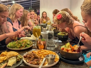 På kvällen gick vi ut i staden för att äta. Vi hade hört i förväg att kulturen på denna sida av landet skilde sig mycket från San Isidro och Stillahavssidan. Både musik, mat och estetik var tydligt påverkade av afro-karibisk kultur. Och de karibiska maträtterna föll i smaken hos alla, så det blev några middagar och luncher ute under helgen. Efter middagen blev det karaoke och salsa på en nattklubb i närheten. Där imponerade studenterna stort – både med dans och sång.